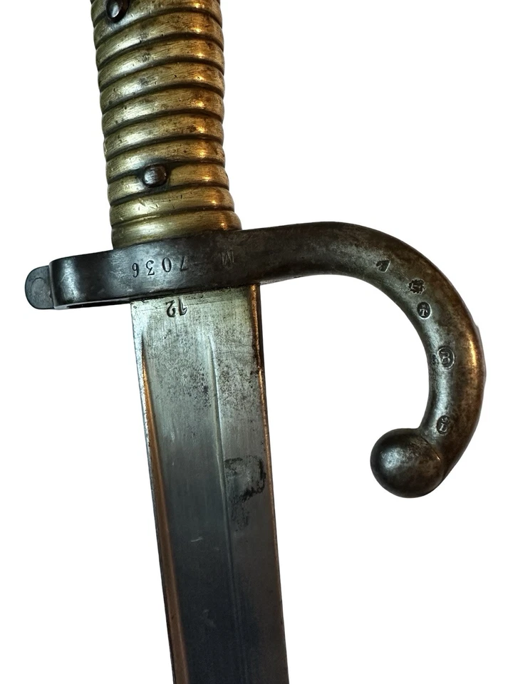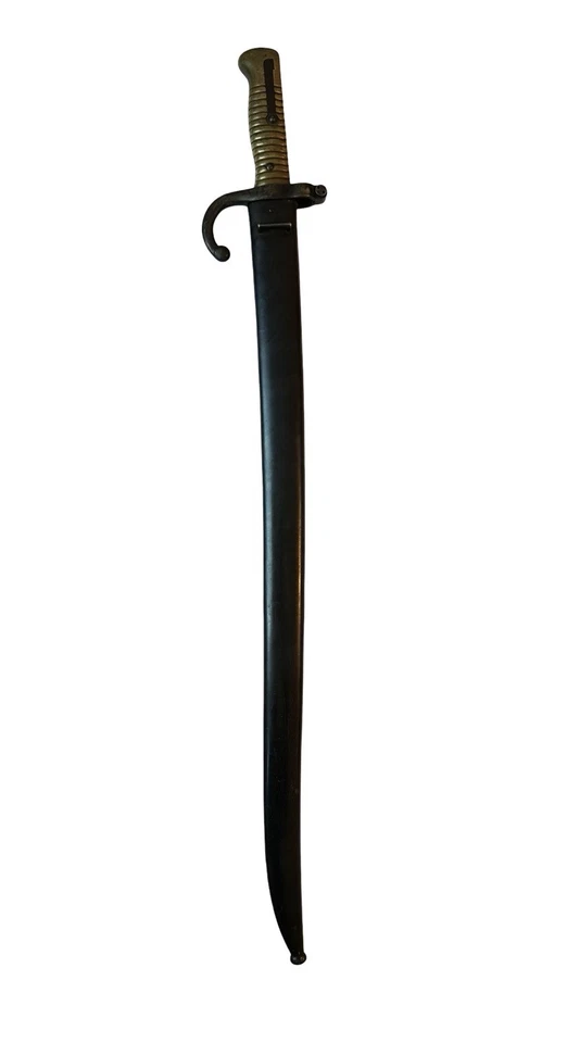 The French Chassepot bayonet, officially known as the Model 1866 bayonet, was designed for use with the Chassepot rifle (Fusil modèle 1866), a revolutionary bolt-action needle rifle adopted by the French Army in 1866. This bayonet is one of the most recognizable 19th-century military blades, notable for its Yataghan-style curved blade and distinctive hooked quillon. Very nice condition. Matching numbers. Never cleaned, original condition. Solid and attractive bayonet. The Chassepot bayonet marked a significant evolution in French saber bayonets, being the first to incorporate a hooked quillon. This design element was widely favored during the late 19th century, an era in which bayonet combat was closely associated with fencing techniques. The quillon functioned much like that of a sword, serving to deflect an opponent’s blade during a parry and preventing it from sliding downward along the length of the rifle, thereby protecting the soldier’s left arm and hand as they supported the weapon. Contrary to some misconceptions, the quillon was not designed as a blade breaker, nor was it intended to wrench an adversary’s rifle from their grasp. Additionally, while some have suggested it was used for stacking arms, most military rifles of the period were equipped with dedicated stacking swivels or other hardware designed for this purpose. Another distinctive feature of the Chassepot bayonet, inherited from the French Model 1840 bayonet, was its recurved, or “Yataghan-style,” blade. This design, inspired by North African yataghan swords, was widely adopted across the Balkans and the Ottoman Empire, influencing bayonet designs throughout Europe in the latter half of the 19th century. Some have speculated that the recurved shape was intended to keep the blade clear of the bullet’s trajectory; however, given the prevalence of straight sword bayonets during the black powder era and the absence of any contemporary documentation supporting this claim, this theory remains unsubstantiated. In 1883, the noted British author and scholar Richard Burton (not to be confused with the actor) commented on the design, stating: “The ‘curved thrust’ so imposed upon Colonel Mercy, of the French army, that he proposed…to adopt the yataghan, whose beautifully curved line of blade coincides accurately with the motion of the wrist in cutting, and to which he held to be equally valuable for the point.” However, Burton was critical of its application as a bayonet, adding: “As a bayonet it lost all its distinctive excellence; the forward weight, so valuable in cutting with the hand, made it heavy and unmanageable at the end of a musket.” Despite this critique, the widespread adoption of the yataghan-style blade suggests that military tacticians of the period placed considerable trust in French weapon design. Lastly, the Chassepot bayonet featured fullers—longitudinal grooves hollowed into the blade. These are often erroneously referred to as “blood grooves,” with the mistaken belief that they were designed to release blood or prevent suction within a wound. In reality, fullers function similarly to the flanges of an “I” beam in structural engineering, reducing the blade’s weight while maintaining its strength and rigidity. This innovation allowed for a more maneuverable yet durable weapon, reinforcing the balance between effectiveness and practicality in 19th-century bayonet design.