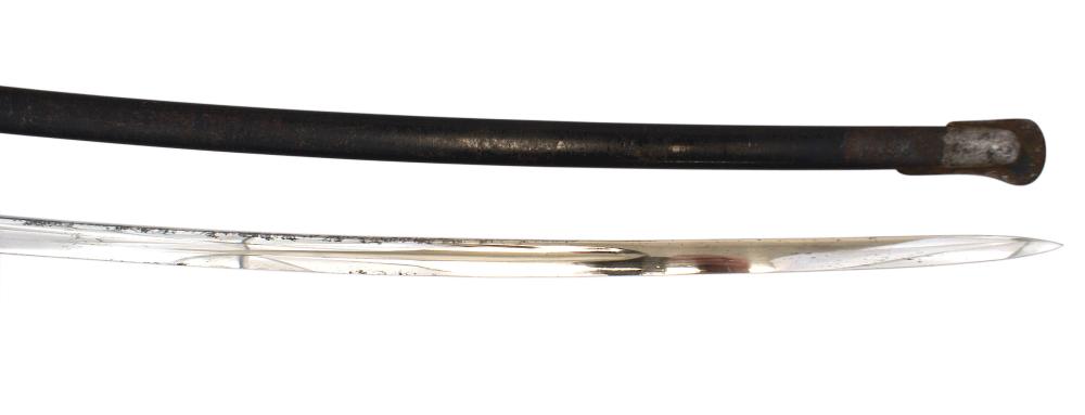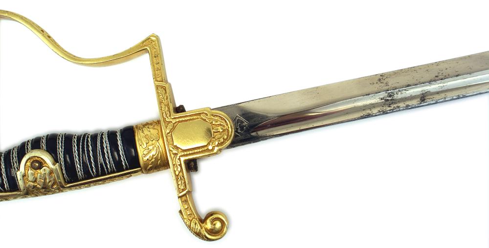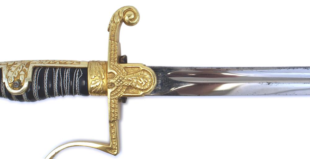 German Third-Reich Army officer’s dress sword. 100% gilt finish on the aluminum relief oak-leaf decorated pommel/backstrap, reverse “P” knuckle bow and ferrule. 100% gilt on the relief eagle/swastika crossguard (Nice elongated, art-deco style eagle wings) and reverse langet. The gold gilt is MINT. Fairly clean 29″ slightly curved blade. Maker marked with a crisp cougar profile and “PUMA” above “SOLINGEN”. The reverse is marked “No. 3”. One ring steel scabbard. Black finish has “dimples” and paint is worn on the drag.
