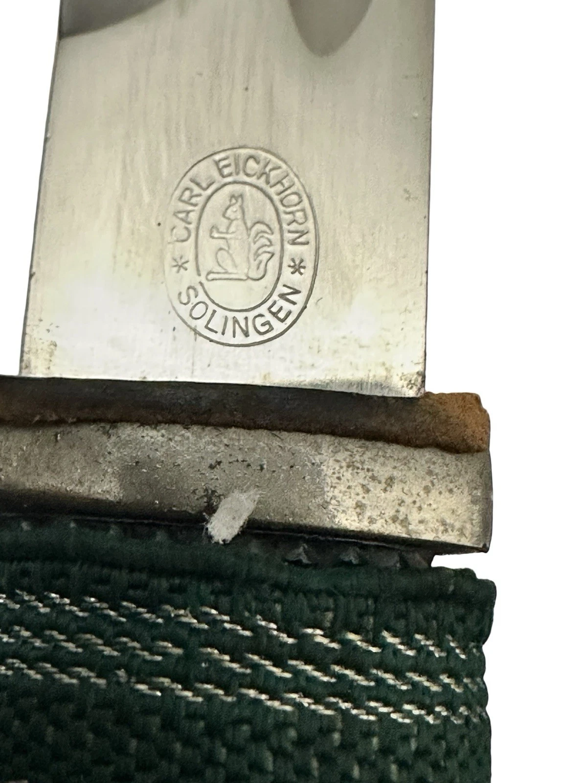 The blade is a bright, polished single-edged dress blade, well finished and showing the maker’s trademark at the ricasso: Carl Eickhorn, Solingen, one of Germany’s most respected edged-weapon manufacturers. The blade remains in very good condition, with light age toning consistent with period wear.