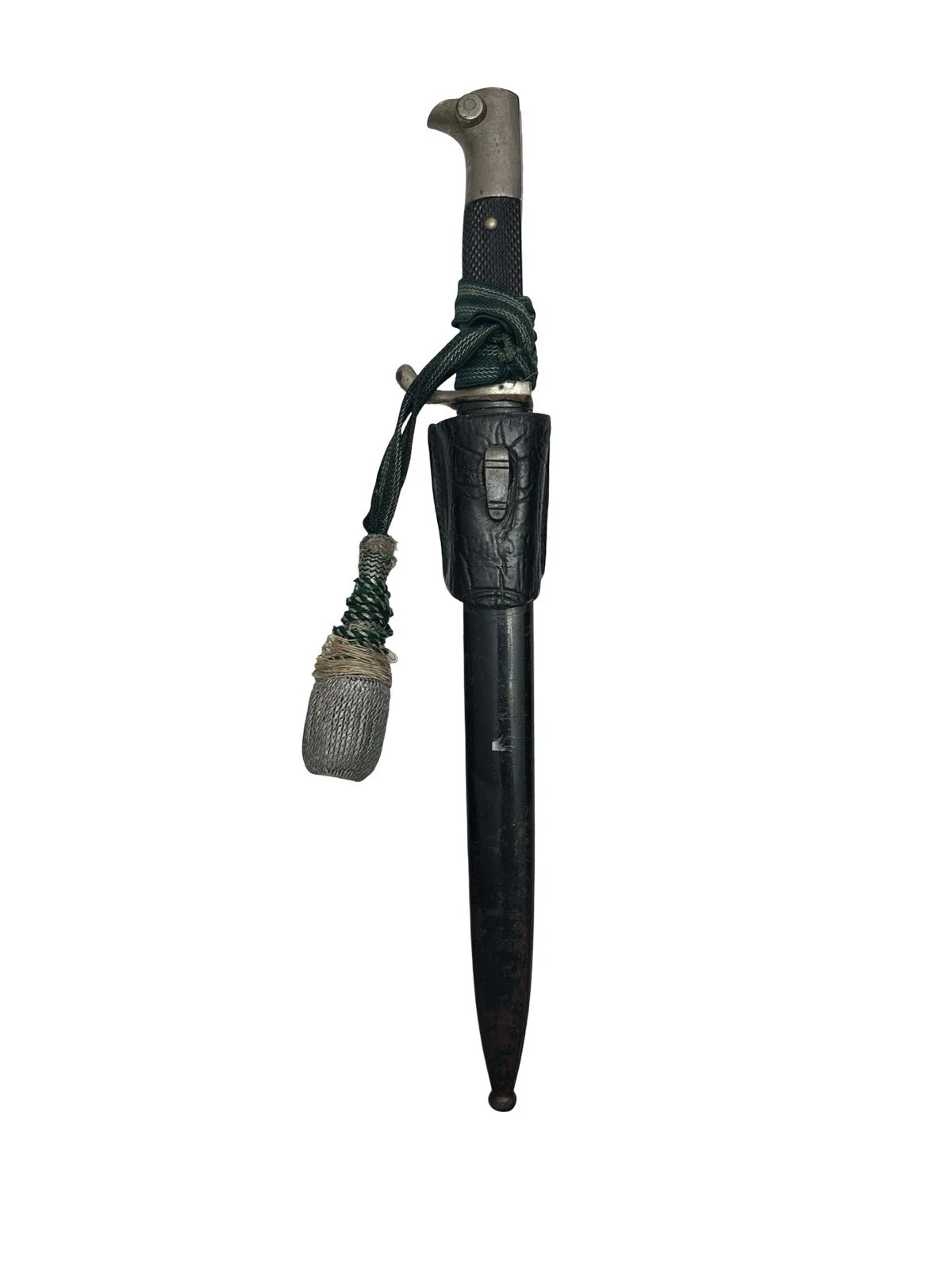 Attached is an original cloth portepee (knot), correctly tied through the crossguard. The scabbard throat and leather frog remain intact, and the bayonet presents as a complete, matching ceremonial set. Overall condition reflects honest age, with surface wear appropriate to parade use rather than field service.